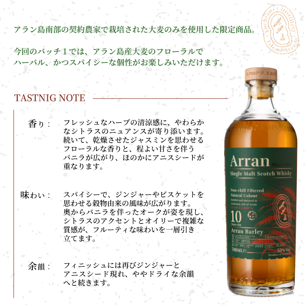 ARRAN BARLEY AGED 10 YEAR BATCH1 SINGLE MALT SCOTCH WHISKY NON-CHILLFILTERED NATURALCOLOUR 700ml 50%
