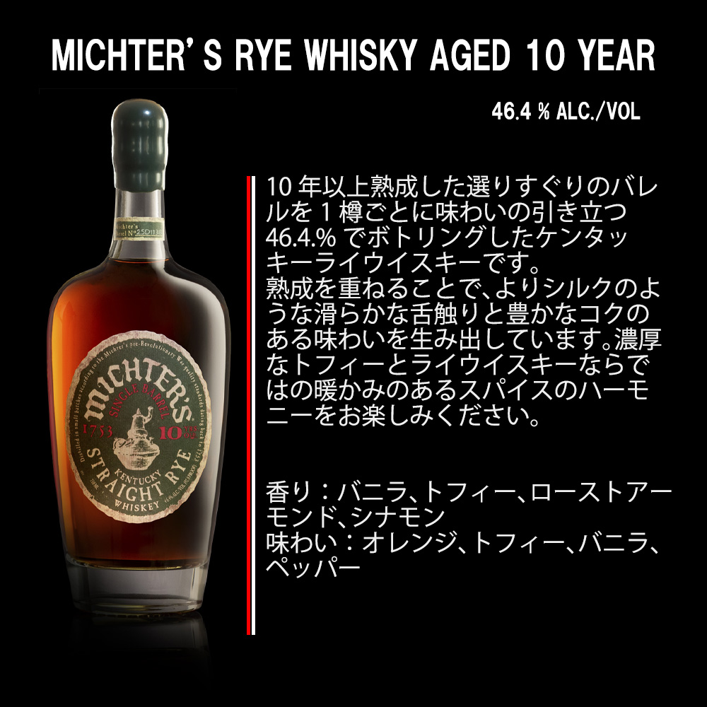 ミクターズは2年連続で、Drinks International社が発表する“世界で最も賞賛されるウイスキー(The World’s Most Admired Whiskey brand)”で1位を受賞!!そんなミクターズより10年以上熟成した選りすぐりのバレルを1樽ごとに味わいの引き立つ46.4.%でボトリングしたケンタッキーライウイスキー!!ミクターズ ライウイスキー10年!!限定入荷!!