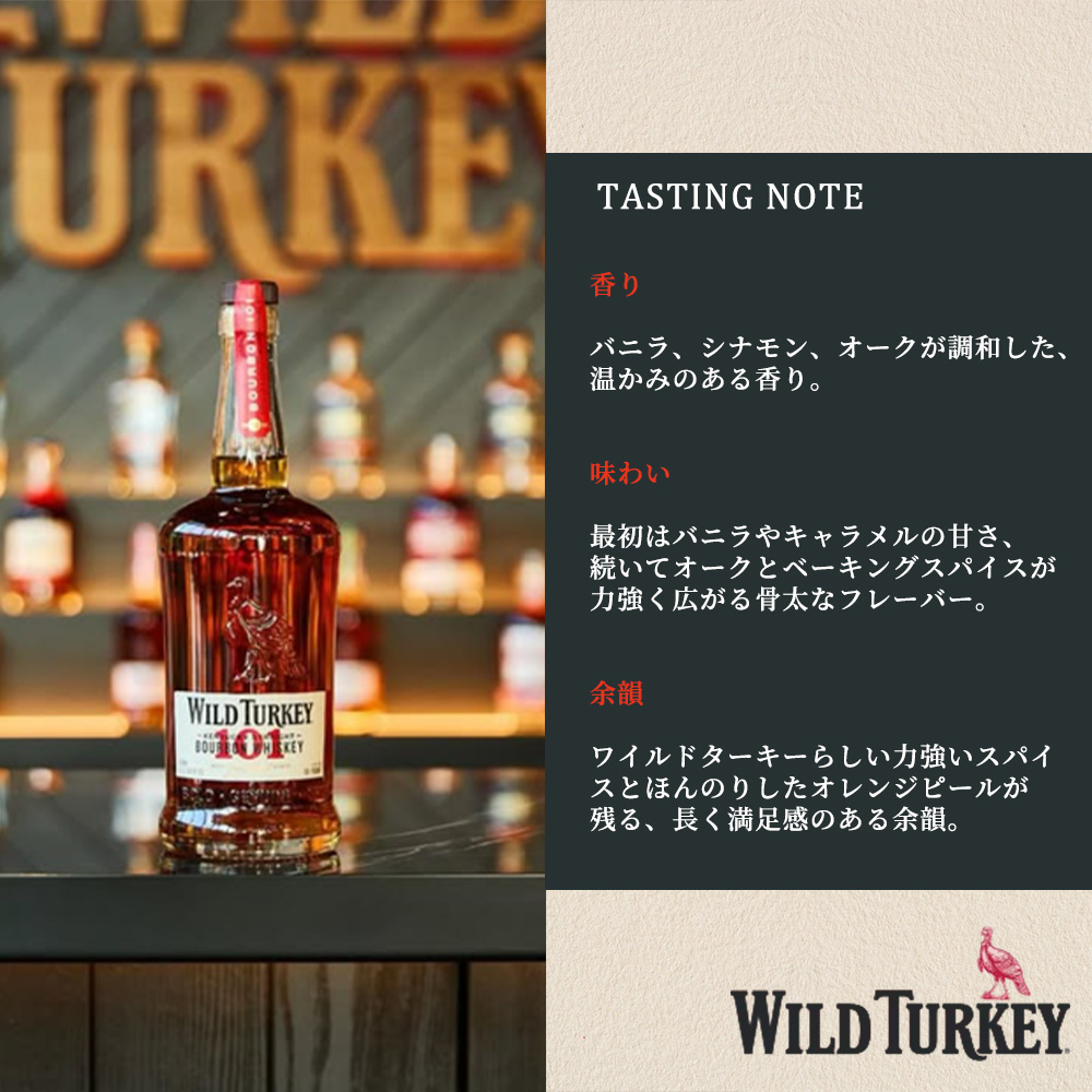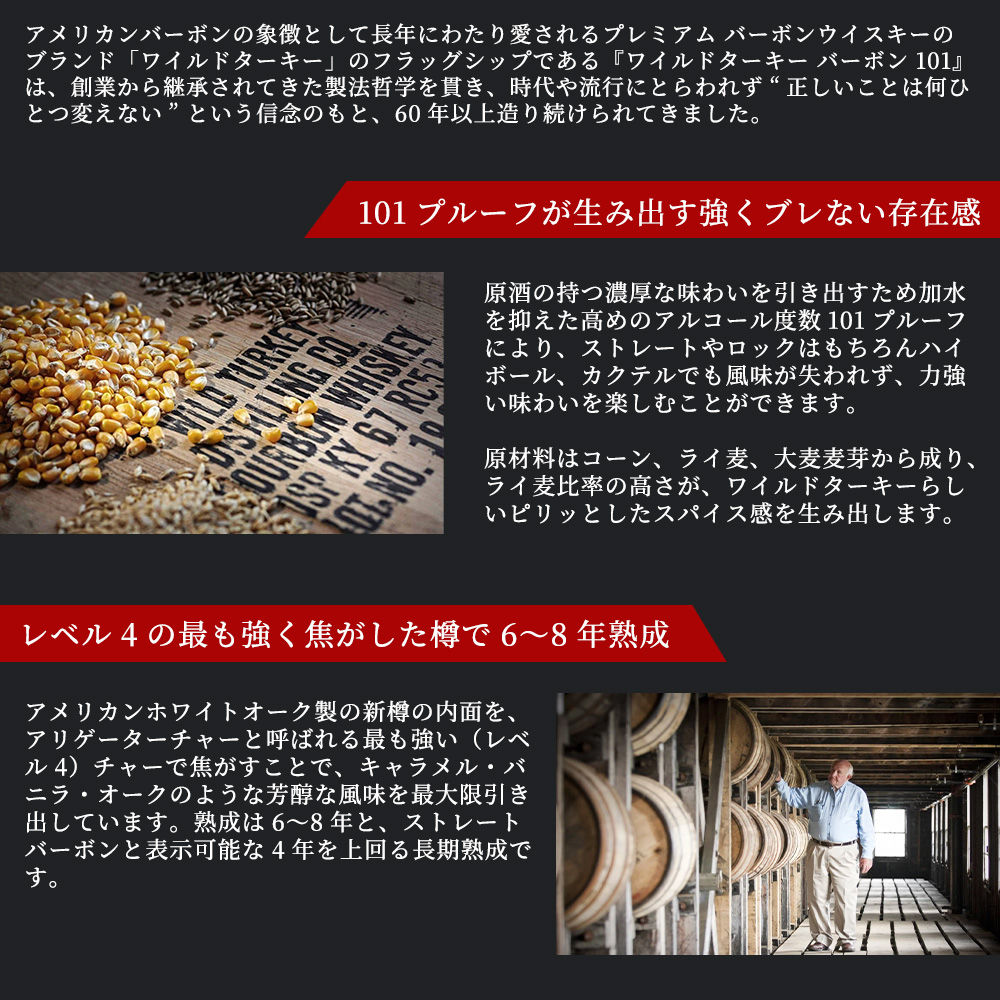 Wild Turkey 101は、「揺るぎない信念に基づく濃厚さ」というブランドの信念を体現する商品です!コーンの比率が低く、アメリカンホワイトオーク樽で最低6年間熟成され、No.4アリゲーターチャーによって穀物のスパイシーさと個性を引き出しています!深く豊かな琥珀色の液色、黒糖とトーストしたスパイスの香りにトフィーやバニラの味わい!スパイスとオレンジピールのフィニッシュ!ワイルドターキーファン必見の逸品です!!