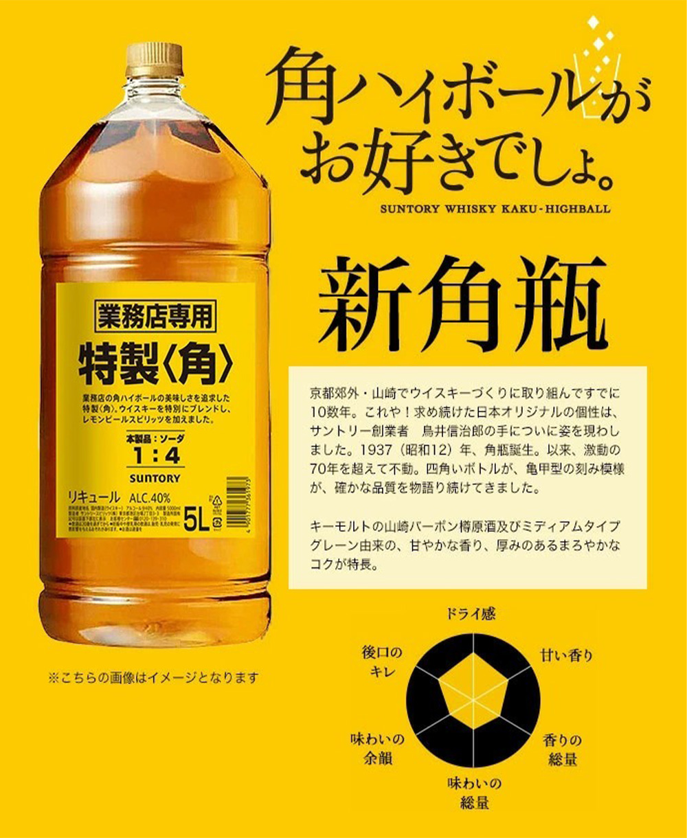国産ウイスキー愛好家必見!!業務店様必見!!ハイボールでも大人気の角瓶!!外食時にお店で飲む角ハイボールの美味しさを追求した、新5Lペット!!特に強い炭酸で引き立つ味わいと香りが特長の業務店専用の中身!!