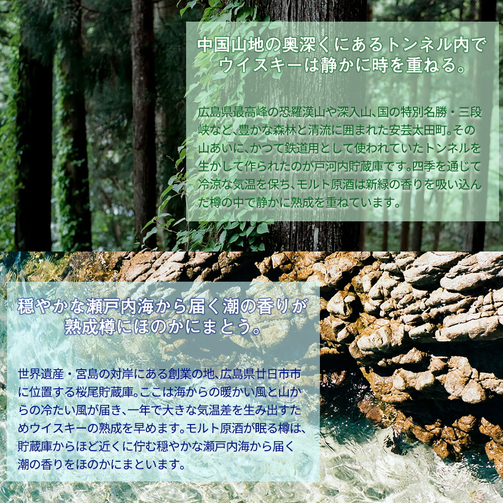 自然体で、自然を味わう!!自社で蒸留・熟成したモルトウイスキー・グレーンウイスキーのみを使用した逸品!!穏やかな瀬戸内の潮の香りと、自然あふれる山あいのトンネル内で新緑の香りをまとった樽で熟成されたウイスキー原酒を使用したブレンデッドジャパニーズウイスキー!!