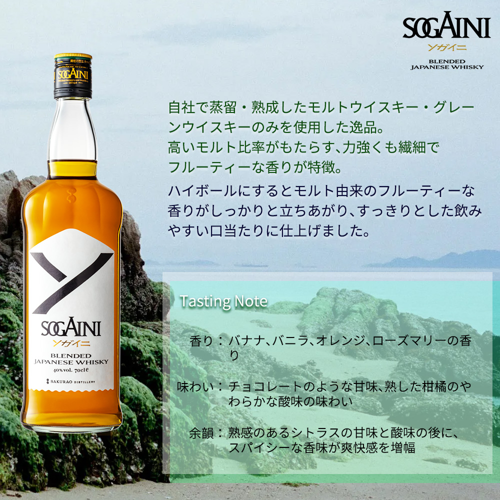SOGAINI(ソガイニ)!!は広島の言葉で“そんなに”を意味し、 SOGAINIこだわったウイスキー!!高いモルト比率がもたらす、力強くも繊細でフルーティーな香りが特徴!!ハイボールにするとモルト由来のフルーティーな香りがしっかりと立ちあがり、すっきりとした飲みやすい口当たりに仕上げました!!