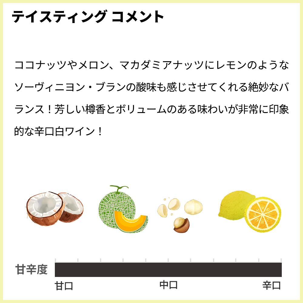 ココナッツやメロン、マカダミアナッツにレモンのようなソーヴィニヨン・ブランの酸味も感じさせてくれる絶妙なバランス!芳しい樽香とボリュームのある味わいが非常に印象的な辛口白ワインが最新ヴィンテージで高評価グレイト[2023]年で限定少量入荷!
