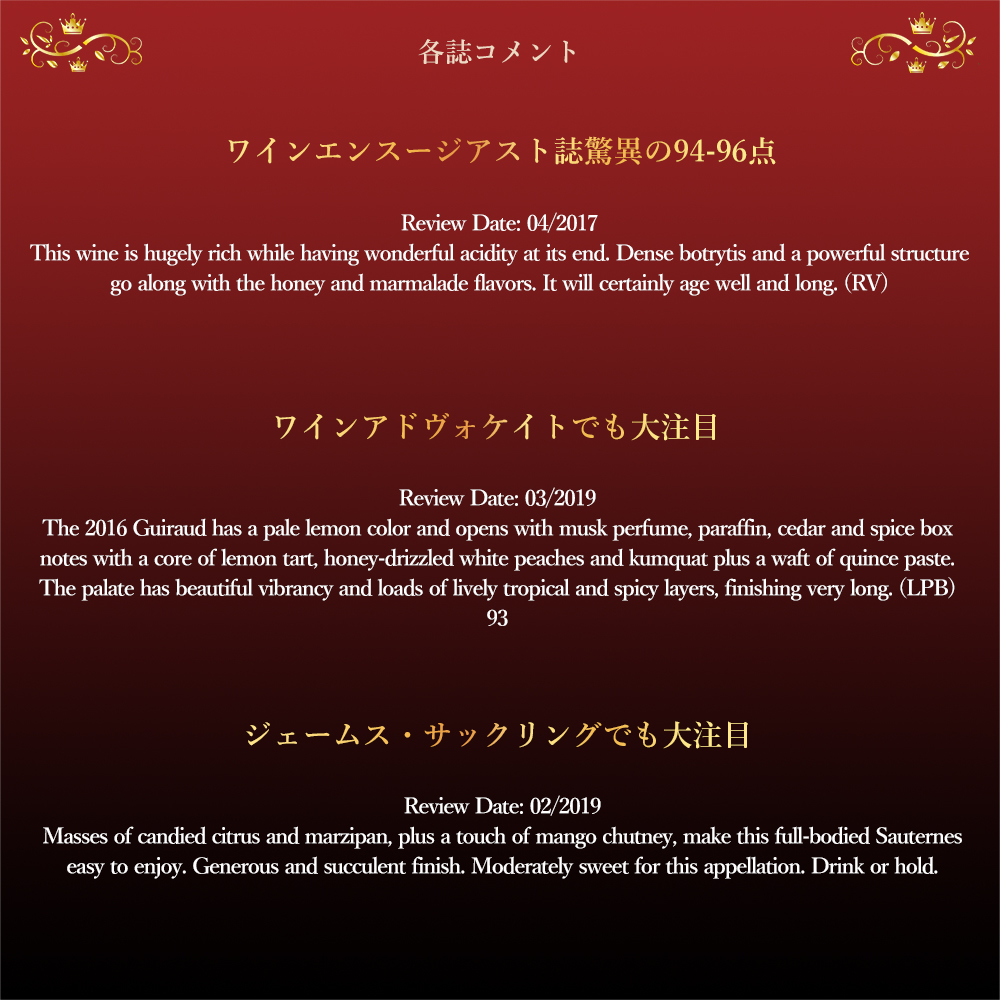 ジェブダナックからも驚異の96点獲得!絶賛コメントは『本レポートで最高峰のソーテルヌの一つが、2016年シャトー・ギローである。ソーテルヌ地域にとってより困難なヴィンテージから生まれた輝かしいワインだ。砂糖漬けの桃、ブラッドオレンジ、キャラメリゼしたパイナップル、蜂蜜の美しく力強い香りが広がり、甘美さと豊潤さをたっぷりと備えながらも、良好な酸味も感じられるフルボディのソーテルヌへと続く。完璧な仕上がりで、今後25-30年にわたり驚くべき愉悦をもたらすだろう。ジェブ・ダナック、2019年2月』と大注目!