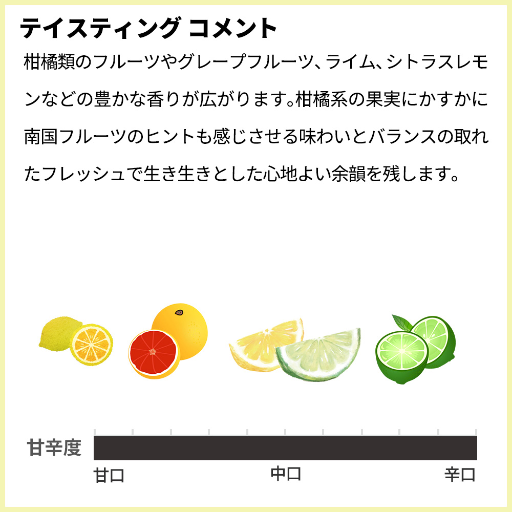 このワインは、淡いみどりがかったイエローカラーの外観に柑橘類のフルーツやグレープフルーツ、ライム、シトラスレモンなどの豊かな香りが広がります。柑橘系の果実にかすかに南国フルーツのヒントも感じさせる味わいとバランスの取れたフレッシュで生き生きとした心地よい余韻を残します。