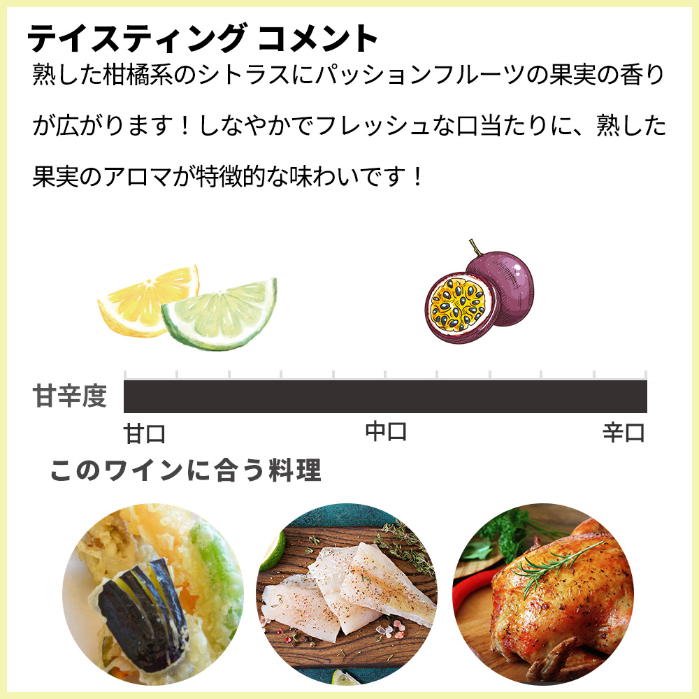 ワインは輝く淡いゴールデンカラーの外観に、熟した柑橘系のシトラスにパッションフルーツの果実の香りが広がります!しなやかでフレッシュな口当たりに、熟した果実のアロマが特徴的な味わいです!フレッシュな飲み口と果実味溢れる味わいが格別です。