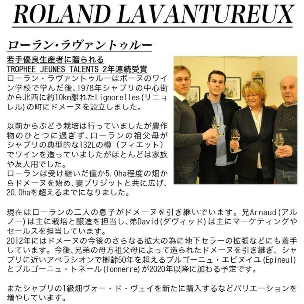 ローラン・ラヴァントゥルー氏がボーヌのワイン学校で学んだ後、1978年シャブリの中心街から北西に約10km離れたLignorelles(リニョレル)の街にドメーヌを設立!一族では以前からブドウ栽培を行っていましたが、農産物のひとつに過ぎず、ローランの祖父母も若干のシャブリを生産していましたが、生産されたワインのほとんどは家族や友人用の自家消費用でした!ローラン氏は受け継いだ5ha程の畑からドメーヌとしてはじめ、妻ブリジットさんと共に地道に広げていき、現在では20hを超えるまでに成長!今ではローラン氏の二人の息子がドメーヌを継承!