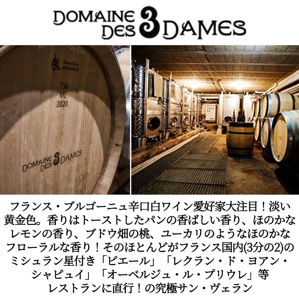 造り手のドメーヌ・デ・トロワ・ダム元詰(3人の貴婦人のドメーヌ)(当主シモン・ラヴォー家=2015年元詰開始の新進造り手)について、インポーターの上田社長のコメントは『相続する畑を持たなかったシモン・ラヴォーは、難関国家資格である「エノログ」(ワイン醸造技師)として活躍していましたが、2014年、後継者に恵まれなかった栽培家の引退に伴って畑を取得するチャンスに恵まれ、生地でもあるソリュトレ・プイィ村に、自身のドメーヌ「デ・トロワ・ダム」を設立しました。(「3人の貴婦人のドメーヌ」という名前は、引退した栽培家の3人の娘さんが彼にチャンスをくれたことに対する感謝の気持ちを表したものであるのと同時に、彼自身が「マコン・ソリュトレ・プイィ」「サン・ヴェラン」「プイィ・フュイッセ」の3つのアペラシオンを植樹したこと、および畑から見ることができる高名な3つの山塊に由来して命名しました)。