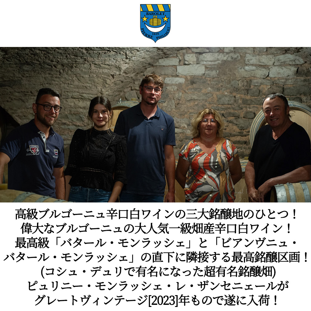 「バタール・モンラッシェ」と「ビアンヴニュ・バタール・モンラッシェ」の直下に隣接する優良区画!のわずか0.37haの石灰質に勝る粘土石灰質土壌の畑からのシャルドネ100%を新樽率50%で12ヶ月間熟成!コシュ・デュリ、ラモネ、ルフレーヴ、アンリ・ボワイヨも所有する“レ・ザンセニエール畑”!洋ナシやサンザシ、アカシアの花のアロマに、ミネラルやレモンにクリーミーなニュアンス!エレガントな中にも凝縮感、力強さが感じられるピュリニーモンラッシェ!フランス国内で90%が消費されてしまう日本市場でも非常に希少だった名門ドメーヌ・バロレ・ペルノがグレートヴィンテージ[2023]年で遂に日本市場に現地のセラー数ヶ月前の蔵出し作品で限定少量入荷!