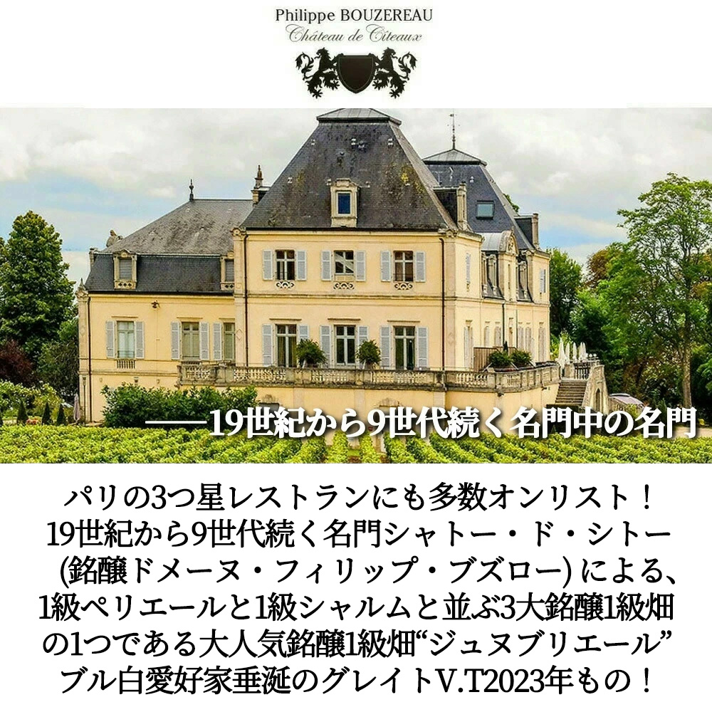 しかも造り手は、19世紀から9世代続く名門中の名門で、パリの3つ星ピエール・ガニェールや、アルザスの2つ星の名門ル・クロコディール、ポール・ボキューズのブラッスリーなどでもオンリスト!アシェット・ガイド誌でも毎年登場で大注目!ゴーミヨ誌、ベタンヌ&ドゥソーヴ、ラ・ルヴェ・デュ・ヴァン・ド・フランス、デキャンタ誌などワイン誌軒並み大注目!ゴーミヨ誌、ベタンヌ&ドゥソーヴ、ラ・ルヴェ・デュ・ヴァン・ド・フランス、デキャンタ誌などワイン誌軒並み大注目!しかも村の中央にあるシャトー・ド・シトーを引き継ぎ広大な庭園を畑に転換したことでも有名なシャトー・ド・シトー (ドメーヌ・フィリップ・ブーズロー) の元詰もの!有名ワイン評論家いわく、「レ・ジュヌヴリエールはレ・ペリエールと小道ひとつ隔てて隣合わせているが、これも熱烈なファンがいる。優雅で香り高く、ハシバミそのもののようなブーケを持つジュヌヴリエールは、とても優雅で魅惑的なワインである。」と絶賛!