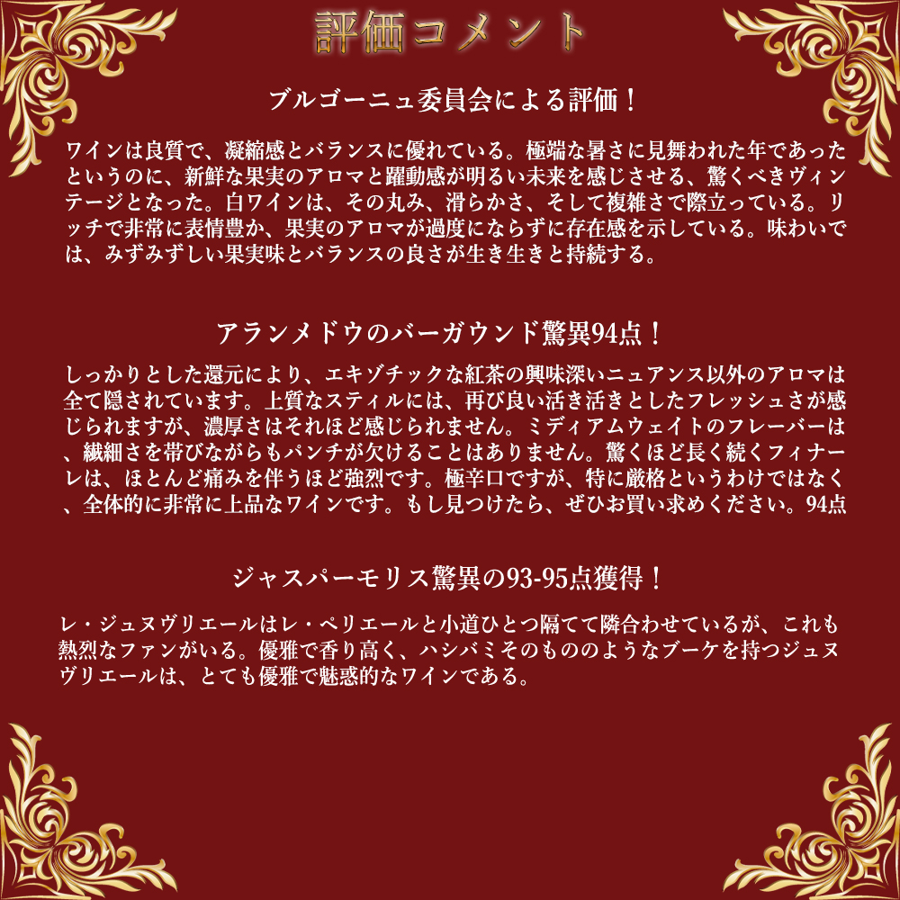 ジャスパーモリス驚異の93-95点獲得!有名ワイン評論家いわく、「レ・ジュヌヴリエールはレ・ペリエールと小道ひとつ隔てて隣合わせているが、これも熱烈なファンがいる。優雅で香り高く、ハシバミそのもののようなブーケを持つジュヌヴリエールは、とても優雅で魅惑的なワインである。」と絶賛!このムルソー・ジュヌヴリエールの最大保有者となっています。