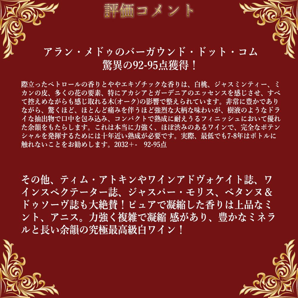 今やパーカーをも凌駕する勢いのアラン・メドゥのバーガウンド・ドット・コムでも驚異の92-95点の高評価!大絶賛コメントは『際立ったペトロールの香りとややエキゾチックな香りは、白桃、ジャスミンティー、ミカンの皮、多くの花の要素、特にアカシアとガーデニアのエッセンスを感じさせ、すべて控えめながらも感じ取れる木(オーク)の影響で整えられています。非常に豊かでありながら、驚くほど、ほとんど痛みを伴うほど強烈な大柄な味わいが、樹液のようなドライな抽出物で口中を包み込み、コンパクトで熟成に耐えうるフィニッシュにおいて優れた余韻をもたらします。これは本当に力強く、ほぼ渋みのあるワインで、完全なポテンシャルを発揮するためには十年近い熟成が必要です。実際、最低でも7-8年はボトルに触れないことをお勧めします。2032+- 92-95点』と大絶賛!