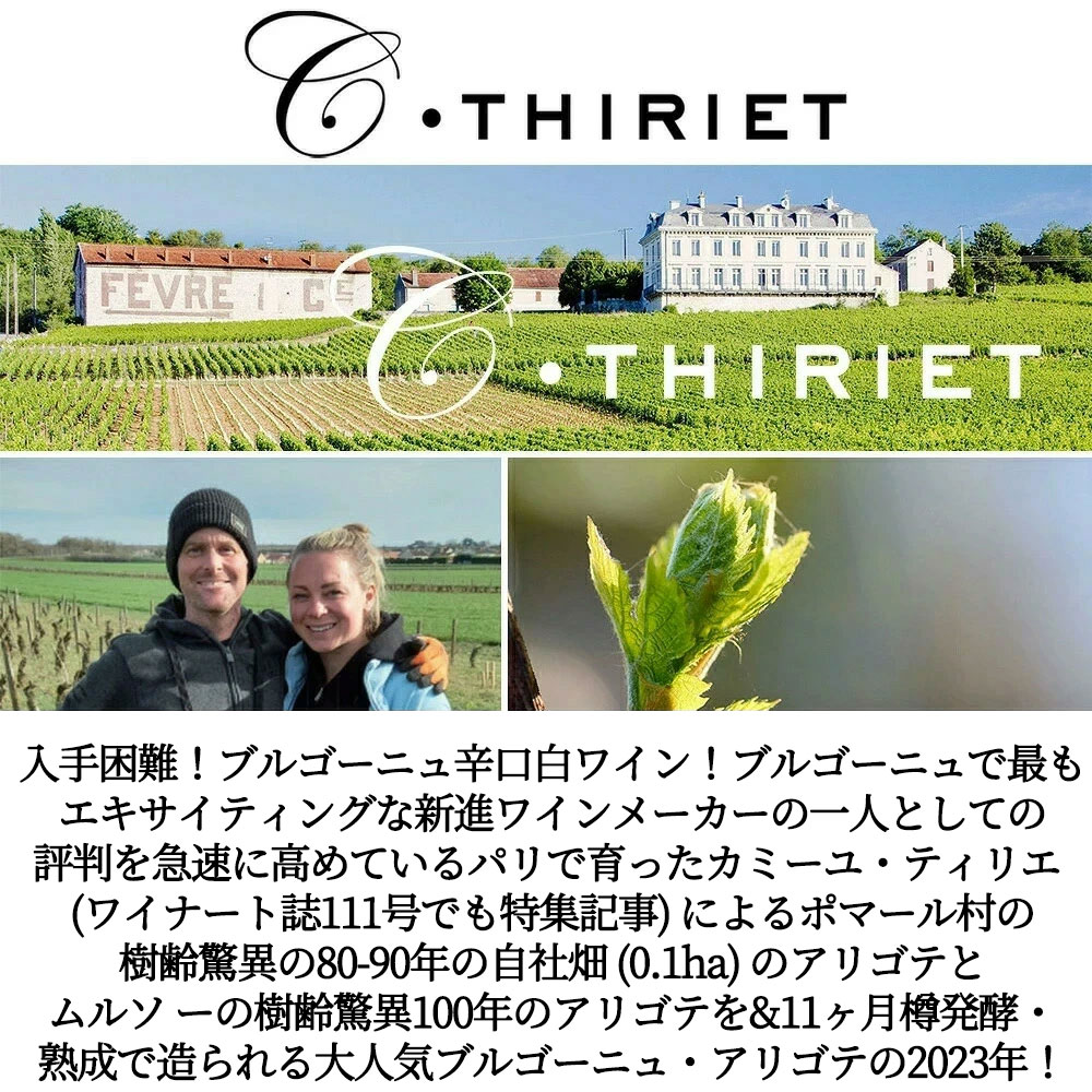 このブルゴーニュ・アリゴテ[2023]年・超限定作品・カミーユ・ティリエでジャスパーモリス88-90点高評価!ポマールの樹齢80-90年の自社畑 (0.1ha) とムルソーの樹齢100年の契約畑 (0.5ha) のブレンド!ポマールの一 部のブドウは除し3日マセラシオン、その他は全房のまま 空気圧プレスで圧搾、11ヶ月樽発酵・熟成(新樽15%)!