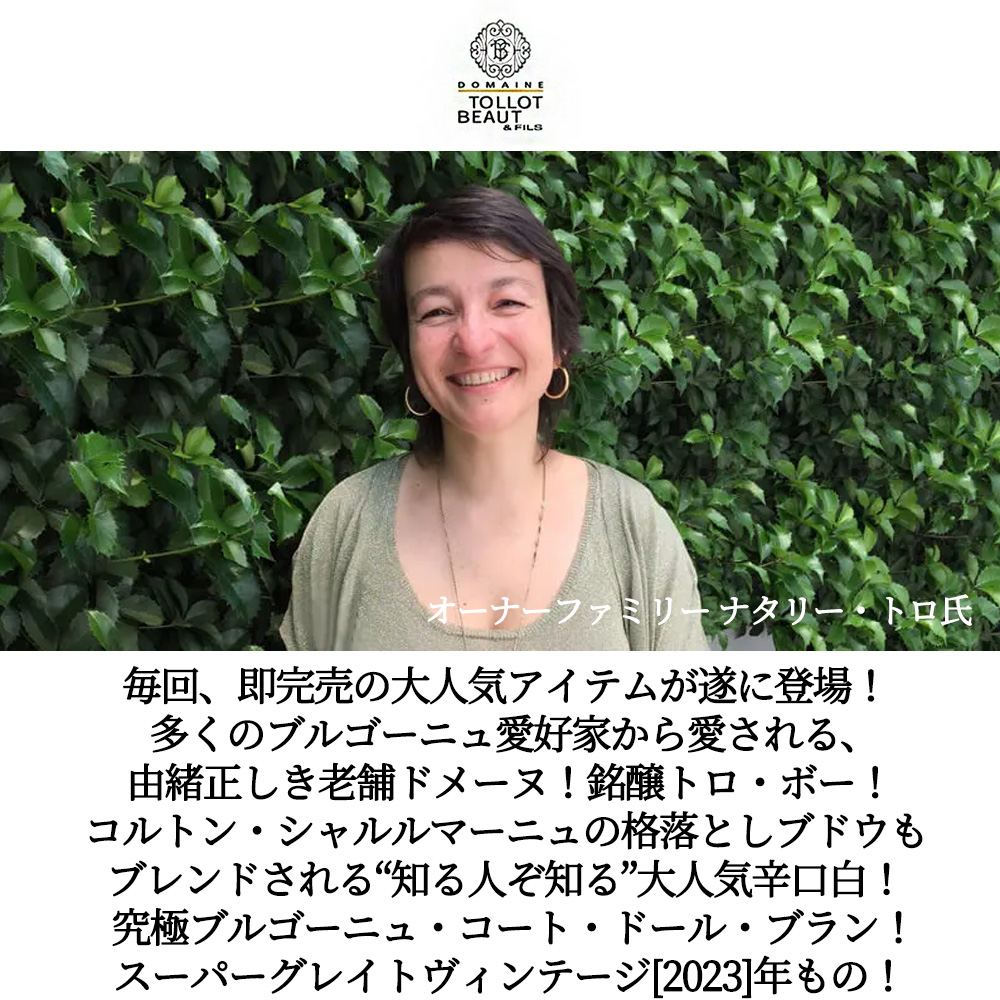 造り手は、ショレイ・レ・ボーヌに本拠地を置き、代々続く由緒正しい家族経営のドメーヌ・トロ・ボー!ドメーヌの歴史は1880年にまで遡り、現在の5代目オーナーであるナタリー氏の曽祖父にあたるアレクサンドル・トロ氏がショレイ・レ・ボーヌに畑を購入したことが始まり!アレクサンドル氏の妻の名字が「ボー」といい、両家の姓が合わさり「トロ・ボー」となりました!現在は、5代目当主ナタリー・トロと、いとこであるジャン=ポール・トロ (奥さんはなんと!ヴォーヌ・ロマネのあのドメーヌ・アンヌ・グロのアンヌさん) !、オリヴィエとともに運営!またトロ・ボーはジュヴレ・シャンベルタンのアルマン・ルソーやニュイ・サン・ジョルジュのアンリ・グージュ、ヴォルネイのマルキ・ダンジェルヴィーユらとともに、ブルゴーニュで最も早くドメーヌ元詰めのワインを出荷し始めた造り手の1人!現在は、サヴィニー・レ・ボーヌ、アロース・コルトン、ボーヌにも畑を買い足し、1970年代には当初18haだった畑を24haにまで拡大!現在は赤ワイン14銘柄、白ワイン2銘柄の合計16ものアペラシオンを手掛けるショレイ・レ・ボーヌを代表する造り手!