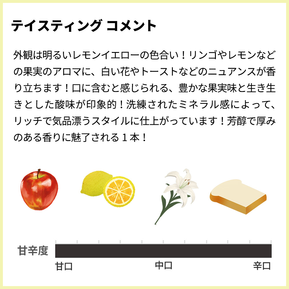 外観は明るいレモンイエローの色合い!リンゴやレモンなどの果実のアロマに、白い花やトーストなどのニュアンスが香り立ちます!口に含むと感じられる、豊かな果実味と生き生きとした酸味が印象的!洗練されたミネラル感によって、リッチで気品漂うスタイルに仕上がっています!芳醇で厚みのある香りに魅了される1本!
