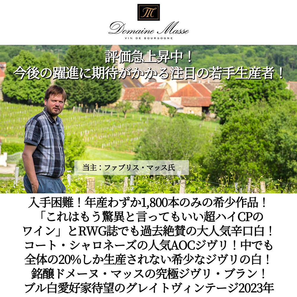 入手困難!フランス辛口白ワインファン大注目!マッスの素晴らしい出来栄え[2023]年!年産わずか1,800本のみ!メルキュレAOCと同じく、コート・シャロネーズの人気AOCジヴリ!中でも全体の20%しか生産されない希少なジヴリの白!柔らかく旨味あふれる赤に対し、白はビシッと筋の通ったタイプ!しかもスーパーグレイトヴィンテージ[2023]年もの!