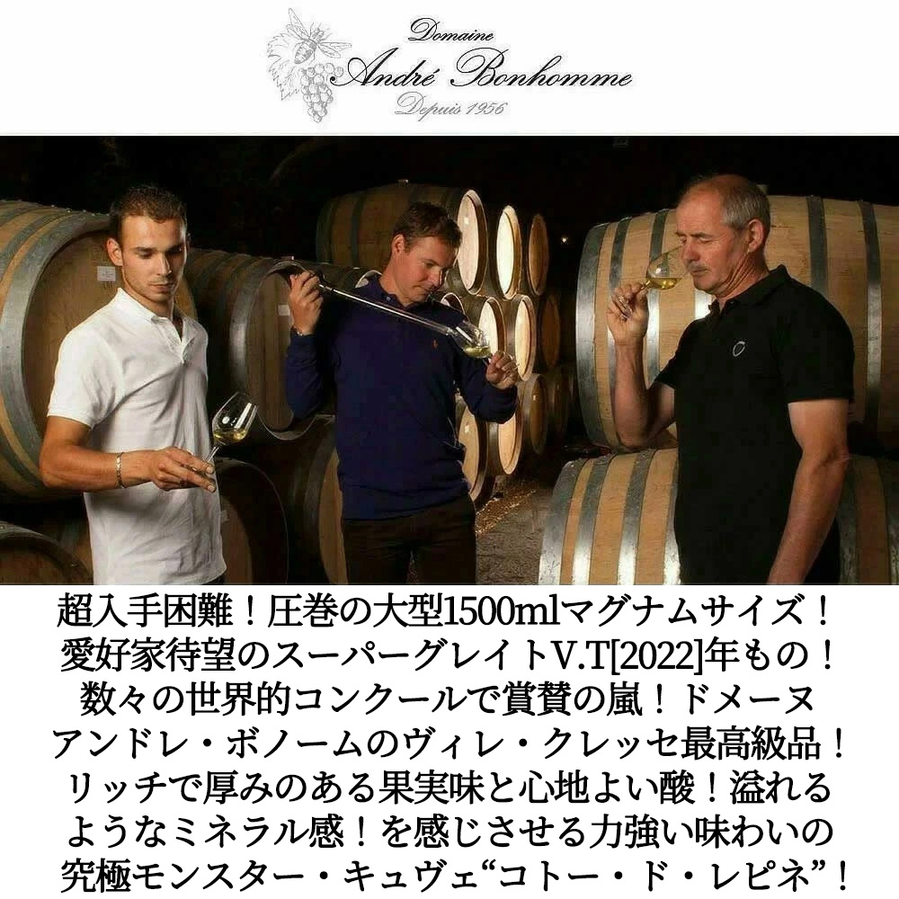 【大型マグナム】ヴィレ・クレッセ・“コトー・ド・レピネ”[2022]年・蔵出し限定品・ドメーヌ・アンドレ・ボノーム元詰・年産わずか700本のみの限定生産品・樹齢驚異の90年のシャルドネをオーク樽で24ヶ月熟成&ステンレスタンク12ヶ月熟成の合計36ヶ月熟成・重厚ボトル・ロウ封印キャップ(ロウキャップにも紋章入り)・1500ml・大型マグナムサイズ