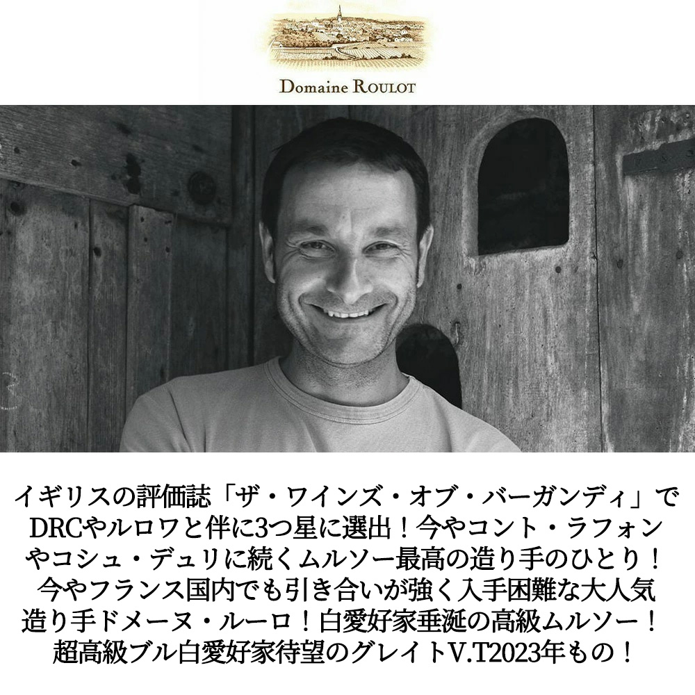 フランス高級ブルゴーニュ辛口白ワイン愛好家大注目!今や、コント・ラフォンやコシュ・デュリに続くムルソー最高の造り手のひとり!であり、英国のM.Wクライヴ・コーツ氏に3つ星生産者に選ばれ、イギリスの評価誌「ザ・ワインズ・オブ・バーガンディ」でDRCやルロワと共に3つ星に選ばれた、今やフランス国内でも引き合いが強く入手困難な大人気造り手のひとり!ドメーヌ・ルーロ!による究極ムルソー!しかも大人気グレイトヴィンテージ[2023]年もの (アシェット・ガイド誌2026年版でも17/20点&RVF誌2026年版で94点) のグレイトヴィンテージ[2023]年もので遂に少量入荷!