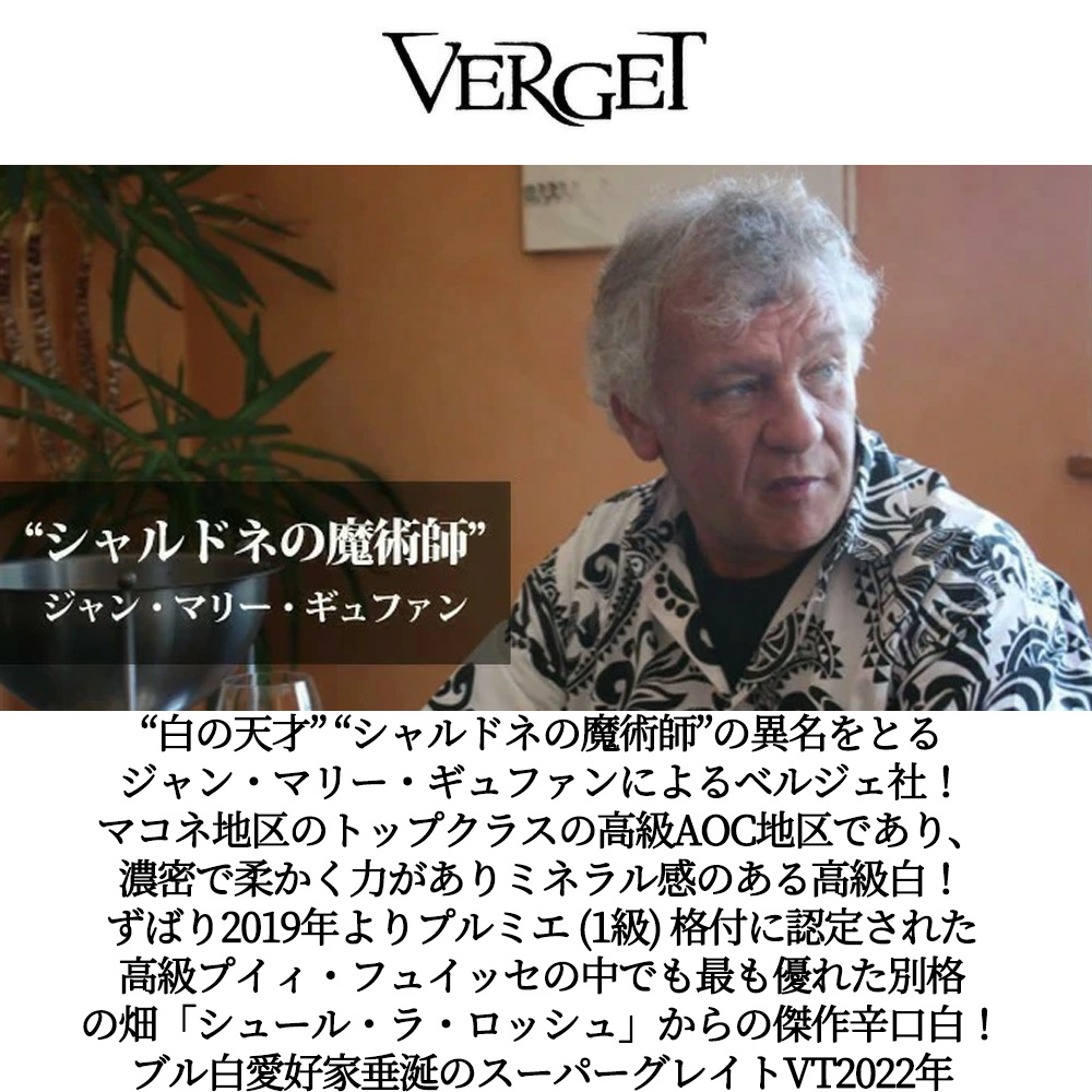 1980年にベルギーより移り住み、マコンの醸造学校でワイン造りを学んだ後に小さなドメーヌを購入し、持ち前の芸術的才能を活かし白ワインをリリース!“シャルドネの魔術師”の異名をとるジャン・マリー・ギュファンの手による大人気プイィ・フュイッセ“シュール・ラ・ロッシュ”!ヴェルジッソン村の石灰岩の岩盤の上にある別格の畑と大注目を受けるフュイッセの中でも最も優れた区画の1つ!しかもヴェルジェの中でも最もミネラルに富んだワイン!“シュール・ラ・ロッシュ”の厳選シャルドネ100%!ファーストプレスの葡萄のみ使用し、フレンチオーク樽新 (樽25%) にて12月下旬まで発酵!その後、7ヶ月木樽で熟成!その後、セメントタンクで澱とともに寝かせリリースされるプイィ・フュイッセの最高級白!