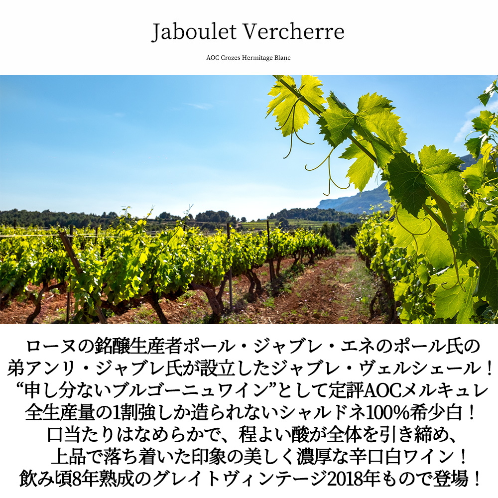 しかも造り手のジャブレ・ヴェルシェールは、1834年、アントワンヌ・ジャブレがローヌ北部のタン・レルミタージュ村に興した、「メゾン・ジャブレ」を起源とします!1881年、彼の2人の息子はそれぞれ自身のメゾンを設立する道を選び、兄のポールはメゾンを継承する形で「ポール・ジャブレ・エネ」を設立、弟のアンリ・ジャブレがブルゴーニュのボーヌに「ジャブレ・ヴェルシェール」を設立!以降、「ポマール・クロ・ド・ラ・コマレーヌ」、「ボーヌ・クロ・ド・レキュ」、「コルトン・レ・ブレサンド」等の自社畑を所有するまで成長しましたが、2001年、跡取りに恵まれなかった当主は引退に伴い、畑の大部分やメゾンを、「メゾン・ルイ・マックス」に売却!現在は、ルイ・マックスが“ジャブレ・ヴェルシェール”の名に敬意を払い、事業を継続しています!