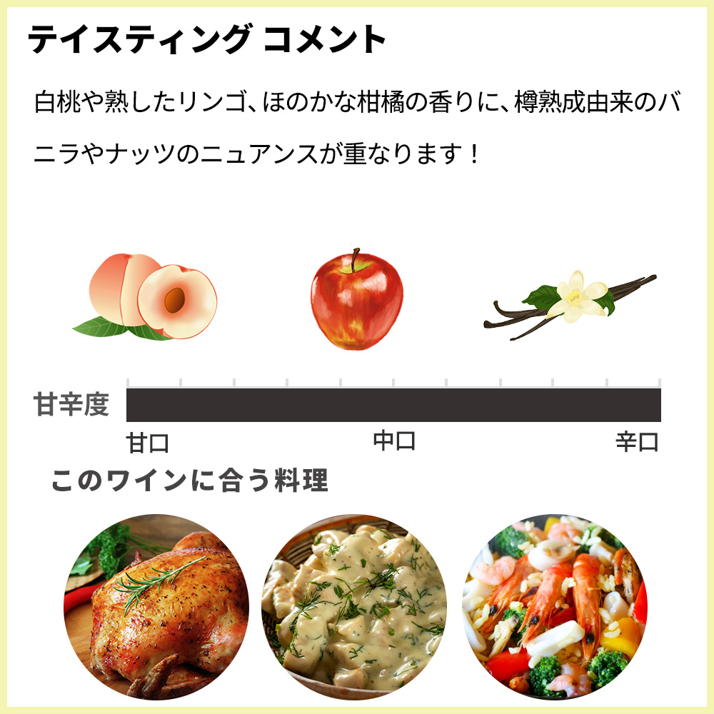 白桃や熟したリンゴ、ほのかな柑橘の香りに、樽熟成由来のバニラやナッツのニュアンスが重なります!口当たりはなめらかで、程よい酸が全体を引き締め、余韻にはほのかなトースト香とミネラルが残り、上品で落ち着いた印象の美しく濃厚な辛口白ワイン!