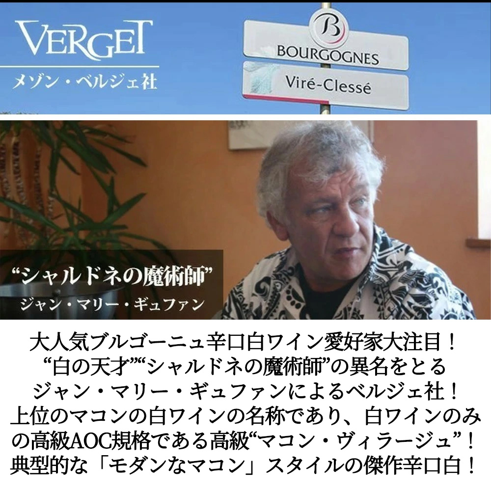 フランス・R.V.F誌でもマコンで唯一の最高評価満点★★★3つ星を獲得するドメーヌ・ギュファン・エナンが、これまた1990年より始めたメゾン・ベルジェ社(R.V.F誌では、このメゾン・ヴェルジェもブルゴーニュのメゾンとしては最高の★★2つ星を獲得)1980年にベルギーより移り住み、マコンの醸造学校でワイン造りを学んだ後に小さなドメーヌを購入し、持ち前の芸術的才能を活かし白ワインをリリース!仏2大評価誌 (RVF誌3ッ星、ベタンヌ誌5ッ星)『ブルゴーニュで5ッ星評価はロマネ・コンティやルソーを含めて11軒のみ。白ワインの魔術師』として定評!毎年最高評価を得るシャルドネの専門家!その天才的ワイン造りを活かしたネゴシアン部門も高い評価を得ている。(『ヴェルジェでは常に良い葡萄を自分で選んでその 畑の表情を引き出す。楽しい仕事だ。ギュファン・エナンは自分の葡萄のポテンシャルを毎年確認し、高めるのだ』)まさに食事に寄りそう典型的マコン!“シャルドネの魔術師”の異名をとるジャン・マリー・ギュファンの手による大人気マコン・ヴィラージュ!