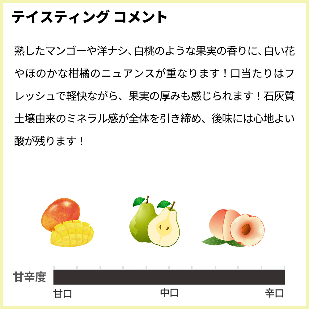 熟したマンゴーや洋ナシ、白桃のような果実の香りに、白い花やほのかな柑橘のニュアンスが重なります!口当たりはフレッシュで軽快ながら、果実の厚みも感じられます!石灰質土壌由来のミネラル感が全体を引き締め、後味には心地よい酸が残ります!バランスが良く、クリーンで飲み疲れしないスタイルの究極マコン・ヴィラージュがグレイトヴィンテージ[2023]年で正規品で限定で少量入荷!