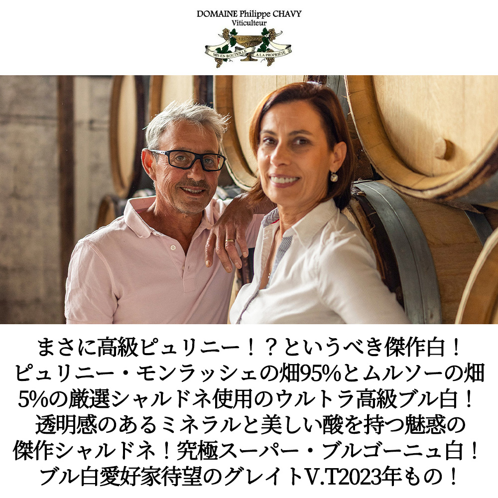 しかも造り手はル・モンラッシェやラムローズなどの3つ星レストランご用達!ジャンシス・ロビンソン女史も大注目!デカンタ誌も大注目!ピュリニィ・モンラッシェ村の中心部にドメーヌを構え、14のアペラシオンに跨る30以上の区画から成る12ヘクタールの自社畑を所有!1950年代に父アルベールが植樹したピュリニーの畑と、母方のロピトー家から相続したムルソーの古い畑が大部分を占める!土壌の潜在力を最大限に引き出すべくビオディナミ農法に転換して厳しく収量制限し、自然のサイクルを重視したブドウ栽培を心掛け、2000年代に入り飛躍的な進歩を遂げた銘醸ドメーヌ・フィリップ・シャヴィによる、なんと!高級ピュリニー・モンラッシェのシャルドネを95%、ムルソーのシャルドネを5%で造られた、ウルトラ究極AOCブルゴーニュ・シャルドネ!母方のロピトー家から伝わる (1932年植樹の) シャルドネや、父方のシャヴィ家の (1950年) シャルドネを含む高級白ワイン!ピュリニーと高級ムルソーのブドウだけで造られる究極ブルゴーニュ・ブラン!