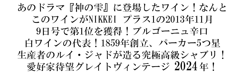 高級ブルゴーニュ辛口白愛好家大注目!高級シャブリ愛好家必買!あの大人気セリエ・ド・ラ・サブリエールが「シャペル・オー・ルー」に名称変更され登場!しかもスーパーグレイトヴィンテージ[2024]年もの!ブルゴーニュ委員会による評価は『ワインは良質で、凝縮感とバランスに優れている。極端な暑さに見舞われた年であったというのに、新鮮な果実のアロマと躍動感が明るい未来を感じさせる、驚くべきヴィンテージとなった。白ワインは、その丸み、滑らかさ、そして複雑さで際立っている。リッチで非常に表情豊か、果実のアロマが過度にならずに存在感を示している。味わいでは、みずみずしい果実味とバランスの良さが生き生きと持続する。』と大絶賛!アシェット・ガイド誌2024年版でも18/20点を付けるスーパーグレイトジ[2024]年もので遂に少量入荷!ドラマ『神の雫』に登場したワインがこれ!ブルゴーニュ辛口白ワインの代表!究極高級シャブリ!ブルゴーニュ高級辛口白ワインの中でも最も人気のある辛口ワインのひとつ!フルーティでミネラル感があって、フレッシュな柑橘系の香りが楽しい、キレのある引き締まった辛口ワイン!ロバート・パーカーで2014年ものが90点の高評価!ワインスペクテーター誌でも2019年版のwebで2016年V.Tを高評価!造り手はパーカー5つ星生産者で、セレナ・サトクリフ女史やル・クラスマン誌も大注目!1859年創立のブルゴーニュの名門、ルイ・ジャド!ステンレス発酵の後、数ヵ月間熟成し蔵出しされる、グレープフルーツや新鮮な柑橘系のフルーツや白い花を思わせる香りのキリッとした辛口!余韻に感じる心地よい酸味!はまさにシャブリの典型!名門ルイ・ジャドの高級シャブリ!最新ヴィンテージでグレイトヴィンテージ[2024年とくれば愛好家大納得!日本正規代理店輸入品で待望の入荷!