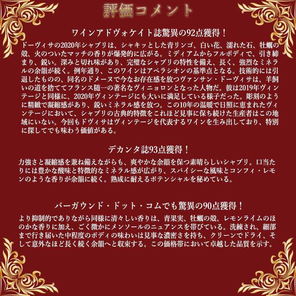 このグレイト[2020]年でワインアドヴォケイト誌驚異の92点でコメントは「ドーヴィサの2020年シャブリは、シャキッとした青リンゴ、白い花、濡れた石、牡蠣の殻、火のついたマッチの香りが爆発的に広がる。ミディアムからフルボディで、引き締まり、鋭い。深みと切れ味があり、完璧なシャブリの特性を備え、長く、強烈なミネラルの余韻が続く。例年通り、このワインはアペラシオンの基準点となる。技術的には引退したものの、同名のドメーヌで今なお存在感を放つヴァンサン・ドーヴィサは、羊飼いの道を捨ててフランス随一の著名なヴィニョロンとなった人物だ。彼は2019年ヴィンテージと同様に、2020年ヴィンテージにも大いに満足している様子だった。彫刻のように精緻で凝縮感があり、鋭いミネラル感を放つ。この10年の温暖で日照に恵まれたヴィンテージにおいて、シャブリの古典的特徴をこれほど見事に保ち続けた生産者はこの地域にいない。今回もドヴィサはヴィンテージを代表するワインを生み出しており、特別に探してでも味わう価値がある。」と高評価!