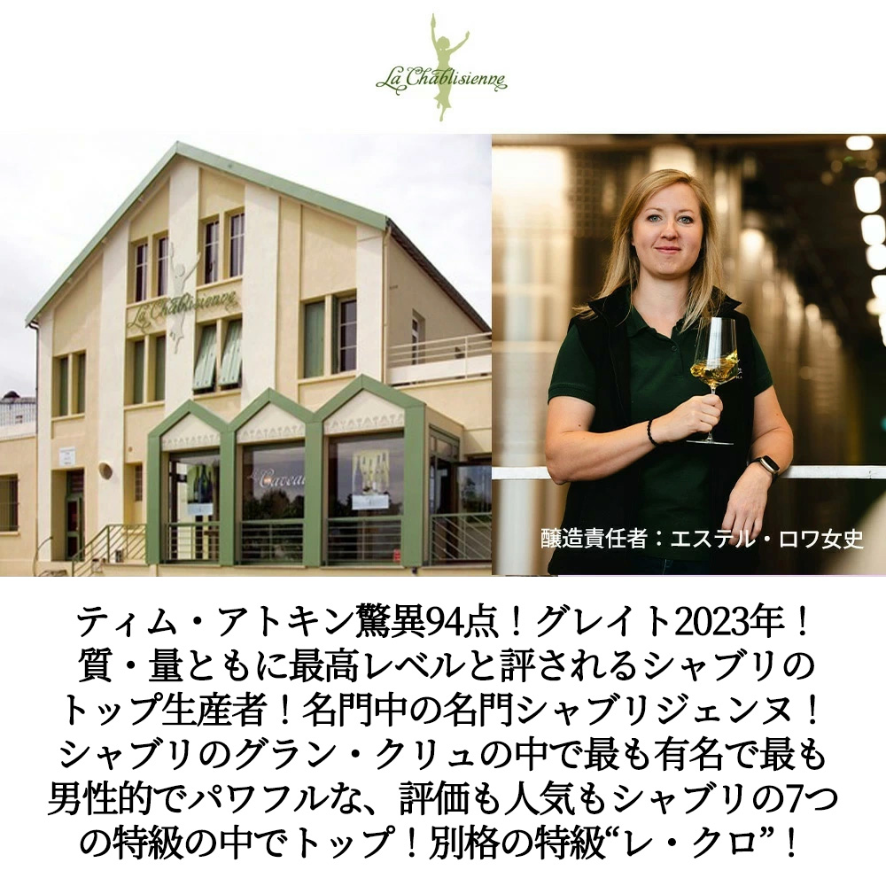 シャブリ・グラン・クリュ・特級・“レ・クロ”[2023]年・正規品・オーク樽発酵&オーク樽(225L)熟成・ラ・シャブリジェンヌ元詰・AOCシャブリ・グラン・クリュ・特級・年産わずか約6000本・自然派・リュット・レゾネ・ティム・アトキン驚異94点