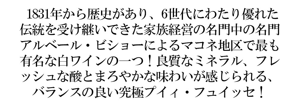しかも造り手は、1831年から歴史があり、6世代にわたり優れた伝統を受け継いできた家族経営の生産者!現在ヴォーヌ・ロマネ村に邸がある、2001年以降品質も人気も急上昇中のドメーヌ・デュ・クロ・フランタン(アルベール・ビショーの自社畑100%)の名でリリースするリシュブール特級をはじめ銘醸特級畑を多数所有することで有名!『ブドウ』『人』『自然環境』を尊重し、ブルゴーニュワインの持つエレガンスを最大限表現することに努めている名門アルベール・ビショー!によるAOCプイィ・フュイッセ!