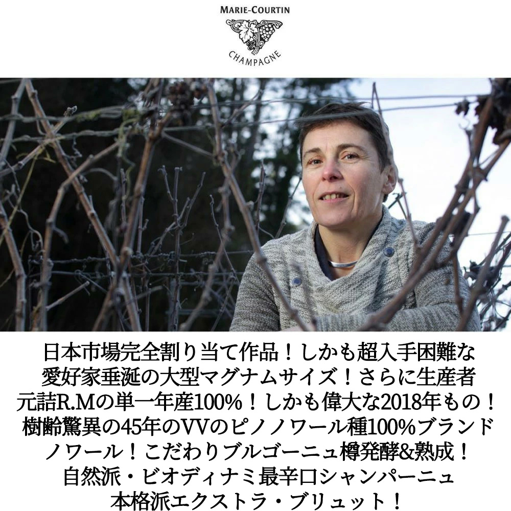 大型サイズ・マリー・クルタン・シャンパーニュ・“エフロールサンス”(開花)・ヴィエイユ・ヴィーニュ・ヴィンテージ[2018]年・エクストラ・ブリュット・ブラン・ド・ノワール(樹齢驚異の45年のVVのピノ・ノワール種100%)・生産者元詰・R.M・蔵出し作品・自然派ビオディナミ(デメテール認証&エコセール認証&ユーロリーフ認証)・ブルゴーニュ樽発酵&熟成・ドザージュ・ゼロ・AOCシャンパーニュ・エペルネで開催されたトロフェ・シャンプノワ(Trophees Champenois )2024年度にて、Vigneron (ne) de l’annee(年間最優秀栽培家賞)を受賞の快挙・大型マグナムサイズ 1500ml・デゴルジュ:2024年2月