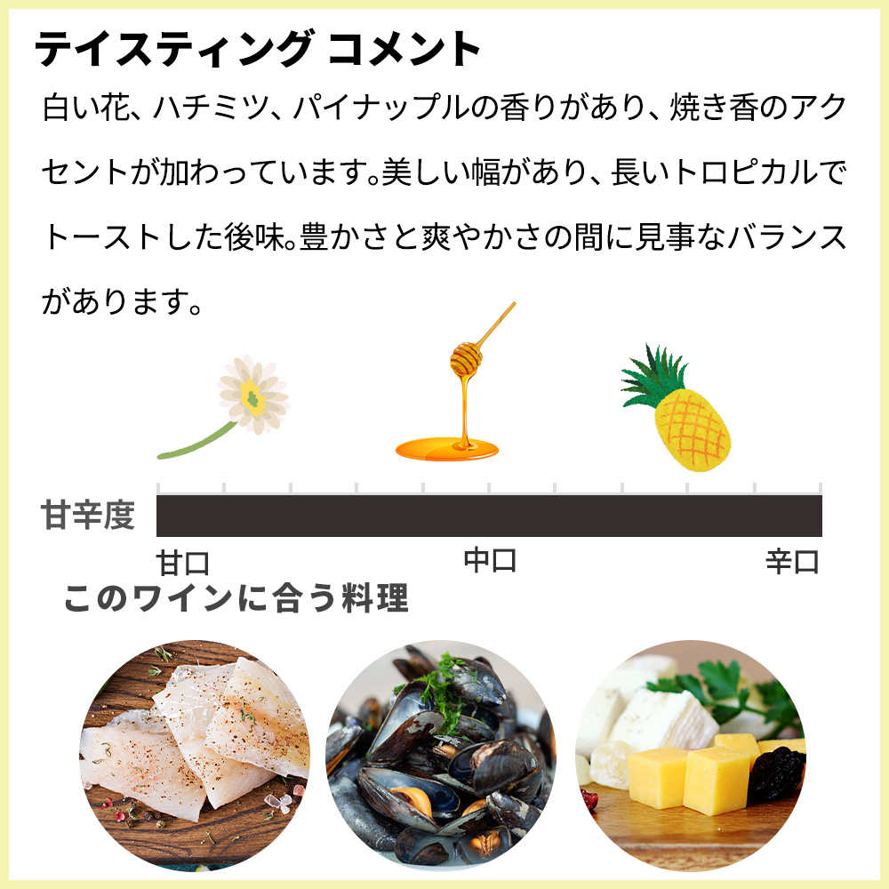 非常に芳香な白ワインで、白い花、ハチミツ、パイナップルの香りがあり、焼き香のアクセントが加わっています。美しい幅があり、長いトロピカルでトーストした後味。豊かさと爽やかさの間に見事なバランスがあります。