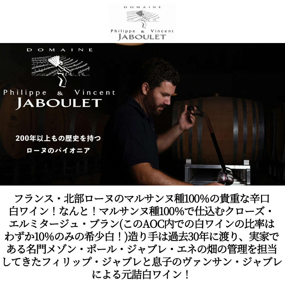 クローズ・エルミタージュ・ブラン[2024]年・蔵出し作品・ドメーヌ・フィリップ・エ・ヴァンサン・ジャブレ元詰・AOCクローズ・エルミタージュ・ブラン・自然派・フランス農水省のHVE(環境価値重視)認証取得・マルサンヌ種100%・ステンレスタンクと樽で8-10ヶ月・(日本入荷わずか108本のみ)