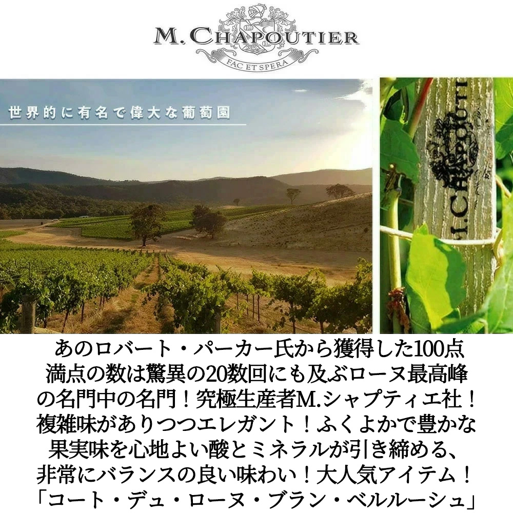 フランス・ローヌ辛口白ワイン愛好家大注目!造り手は、1808年ローヌ川に面しエルミタージュの丘の麓にある街、タン・エルミタージュに創業!R.パーカー100点満点生産者であり、タン・エルミタージュを拠点とする、ローヌ地方を代表する銘醸生産者であり、世界のトップクラスのワイン生産者として知られるM.シャプティ社!あのロバート・パーカーから獲得した100点満点の数は驚異の20数回にも及ぶローヌ最高峰の究極生産者、M.シャプティエが手がけた、「リーズナブルで品質の良いワインを造る」をコンセプトに造られたコート・デュ・ローヌ・ブラン・ベルルーシュ!
