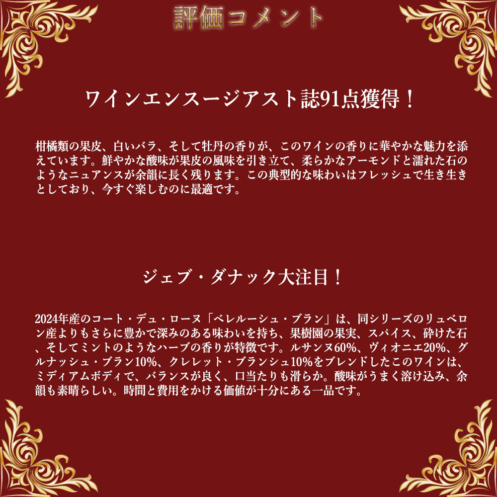 ジェブ・ダナック「2024年産のコート・デュ・ローヌ「ベレルーシュ・ブラン」は、同シリーズのリュベロン産よりもさらに豊かで深みのある味わいを持ち、果樹園の果実、スパイス、砕けた石、そしてミントのようなハーブの香りが特徴です。ルサンヌ60%、ヴィオニエ20%、グルナッシュ・ブラン10%、クレレット・ブランシュ10%をブレンドしたこのワインは、ミディアムボディで、バランスが良く、口当たりも滑らか。酸味がうまく溶け込み、余韻も素晴らしい。時間と費用をかける価値が十分にある一品です。」と大注目!