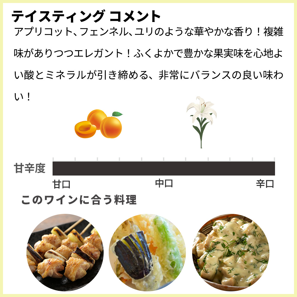 アプリコット、フェンネル、ユリのような華やかな香り!複雑味がありつつエレガント!ふくよかで豊かな果実味を心地よい酸とミネラルが引き締める、非常にバランスの良い味わい!余韻はほのかにアニスのエキゾチックな香りが感じられます!焼き鳥(塩)、天ぷら、クリームシチューなど、幅広いお料理に合わせることができる究極コート・デュ・ローヌ・ブラン・ベルルーシュの大人気ヴィンテージ[2024]年が限定で少量入荷!