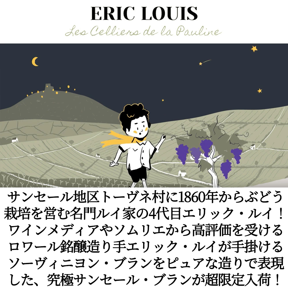 フランス、ロワール辛口白ワイン愛好家大注目!サンセール・ブランファン大注目!ロワール産ソーヴィニヨン・ブラン種100%辛口白ワイン!サンセールと言えば、フランスにおけるソーヴィニヨン・ブランの典型との評価を受ける、「ロワール河対岸のプイイ・フュメよりアロマに富み、生き生きとしていることが多い」と言われるサンセールAOC!このサンセール ブランの[2016]年ものがアシェット・ガイド誌2019年版でWスターの高評価!ロワールのグッドヴィンテージ[2024]年もの!しかも造り手は、レヴュー・デュ・ヴァン・ド・フランス誌大注目!アシェット・ガイド誌2022年版でルイイが満点★★★星付大注目!ジルベール&ガイヤール大注目!ワインエンスージアスト大注目!ワインスペクテーター誌大注目!デカンタ誌大注目!と、ほとんどのワイン評価誌が注目する人気造り手!サンセール地区トーヴネ村に1860年からぶどう栽培を営む名門ルイ家の4代目、エリック・ルイの手により1994年に継承されたドメーヌ!醸造設備の刷新、栽培と醸造の要所における月の運行カレンダーの採用といった革新の推進により、ワインの品質を高め、国内外のワインメディアやフランスを始めとする各国のソムリエなどから高い評価を受けるようになり、自社畑のサンセールにとどまらず、厳格なリュット・レゾネを実践する栽培家たちと契約栽培により、エリック・ルイ自身の手で醸造!サン・テグジュペリの“星の王子さま”の中の「本当に大切なものは目に見えない。」というキツネの有名なセリフに「栽培家、醸造家としての知識や先入観にとらわれることなく、素直な心で“感じるもの”を大切にするようになりました。」と彼自身が素直に述べるように、このサンセール・ブランも地元トーヴネ村、およびメネトレオル・スー・サンセール村の自社畑の粘土石灰質、シレックス土壌の畑からの平均樹齢25年のサンセールをステンレスタンクで6ヶ月シュールリー熟成!ピュアな造りで表現した、人気辛口白ワイン!ラベルの絵もサン・テグジュペリ自身が描いた“星の王子さま”の挿絵からエスプリを得て、ラベルデザインの変更を行いました!新しいラベルの絵は、サンセール出身の風景画家ベルナデット・モロー女史が友人であるエリックのために特別に描いたもの!