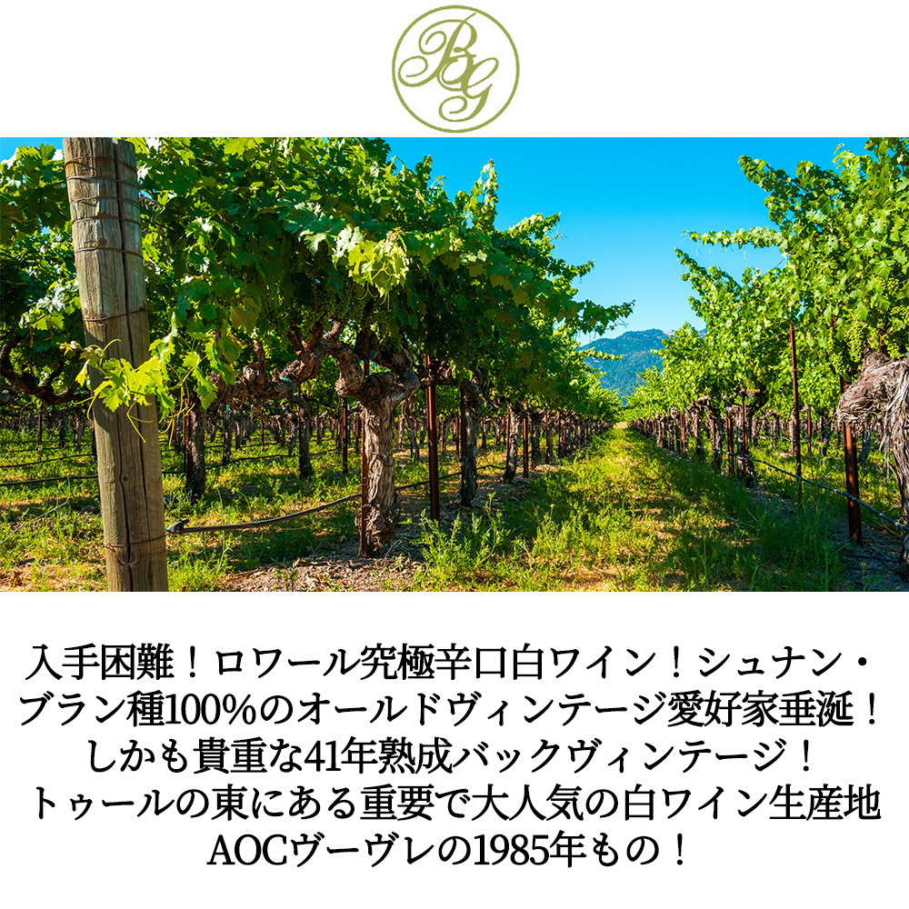 希少!入手困難!ロワール究極辛口白ワイン愛好家大注目!シュナン・ブラン種100%のオールドヴィンテージ愛好家垂涎!しかも貴重な41年熟成バックヴィンテージ!1985年のヴーヴレについてマイケル・ブロードベント氏は「大いに満足のいく年。ヴーヴレは甘味と酸のバランスが完璧で素晴らしい熟成能力を持っている」と絶賛!華麗な古城が点在する、風光明媚なロワールの渓谷!