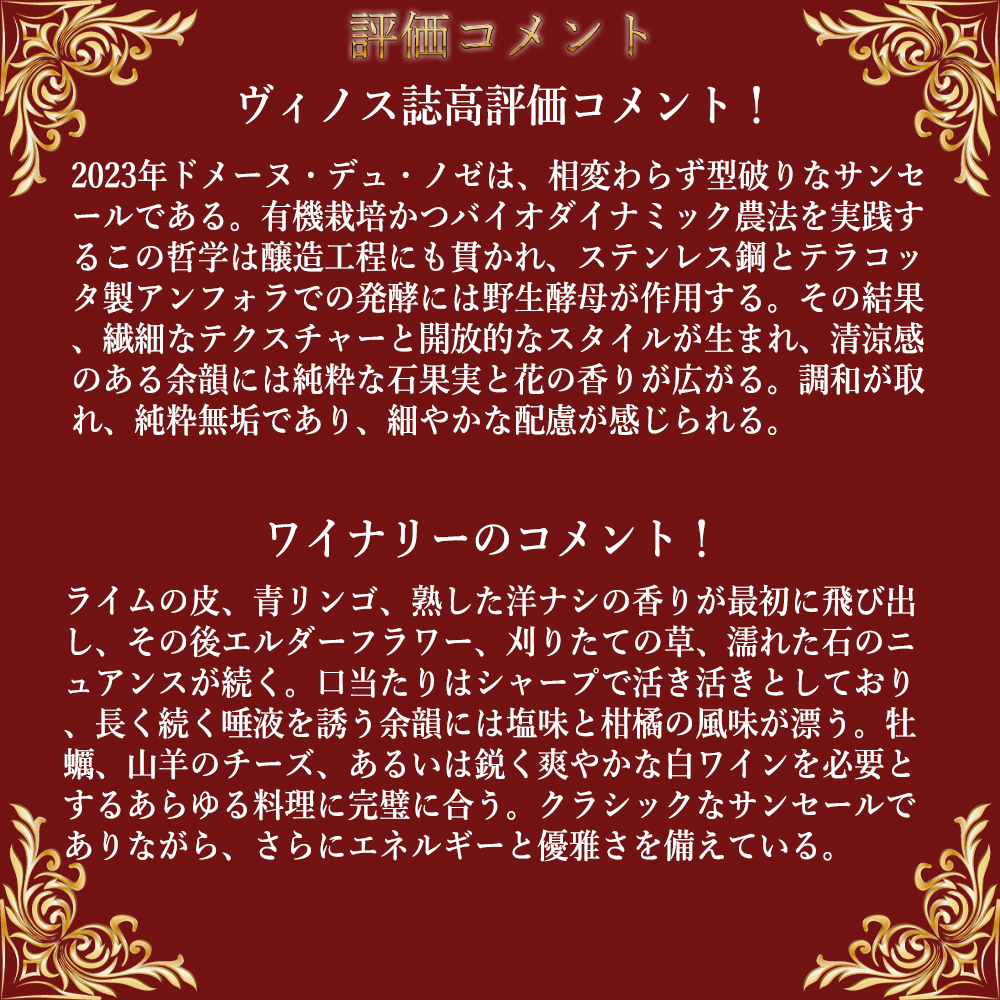 この2023年でヴィノス誌『2023年ドメーヌ・デュ・ノゼは、相変わらず型破りなサンセールである。有機栽培かつバイオダイナミック農法を実践するこの哲学は醸造工程にも貫かれ、ステンレス鋼とテラコッタ製アンフォラでの発酵には野生酵母が作用する。その結果、繊細なテクスチャーと開放的なスタイルが生まれ、清涼感のある余韻には純粋な石果実と花の香りが広がる。調和が取れ、純粋無垢であり、細やかな配慮が感じられる。』と高評価コメント!