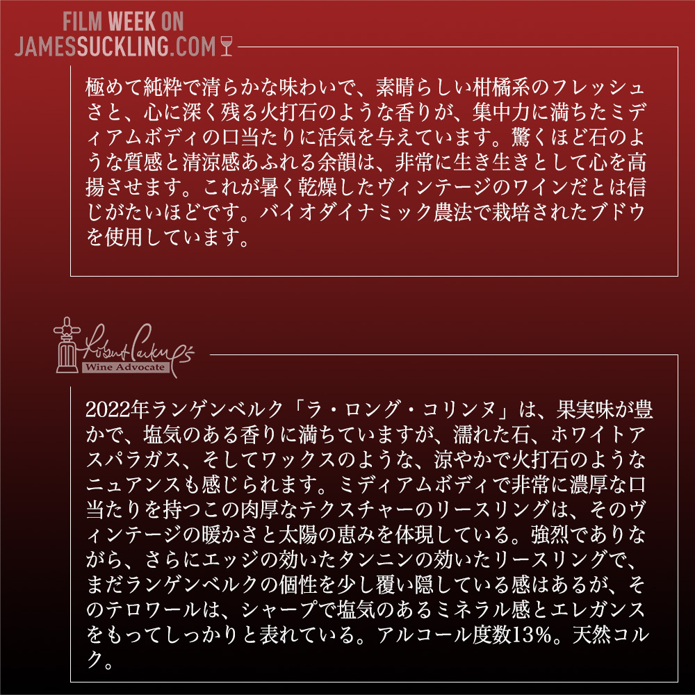 ワインアドヴォケイト92点でコメントは「2022年ランゲンベルク「ラ・ロング・コリンヌ」は、果実味が豊かで、塩気のある香りに満ちていますが、濡れた石、ホワイトアスパラガス、そしてワックスのような、涼やかで火打石のようなニュアンスも感じられます。ミディアムボディで非常に濃厚な口当たりを持つこの肉厚なテクスチャーのリースリングは、そのヴィンテージの暖かさと太陽の恵みを体現している。強烈でありながら、さらにエッジの効いたタンニンの効いたリースリングで、まだランゲンベルクの個性を少し覆い隠している感はあるが、そのテロワールは、シャープで塩気のあるミネラル感とエレガンスをもってしっかりと表れている。アルコール度数13%。天然コルク。」!