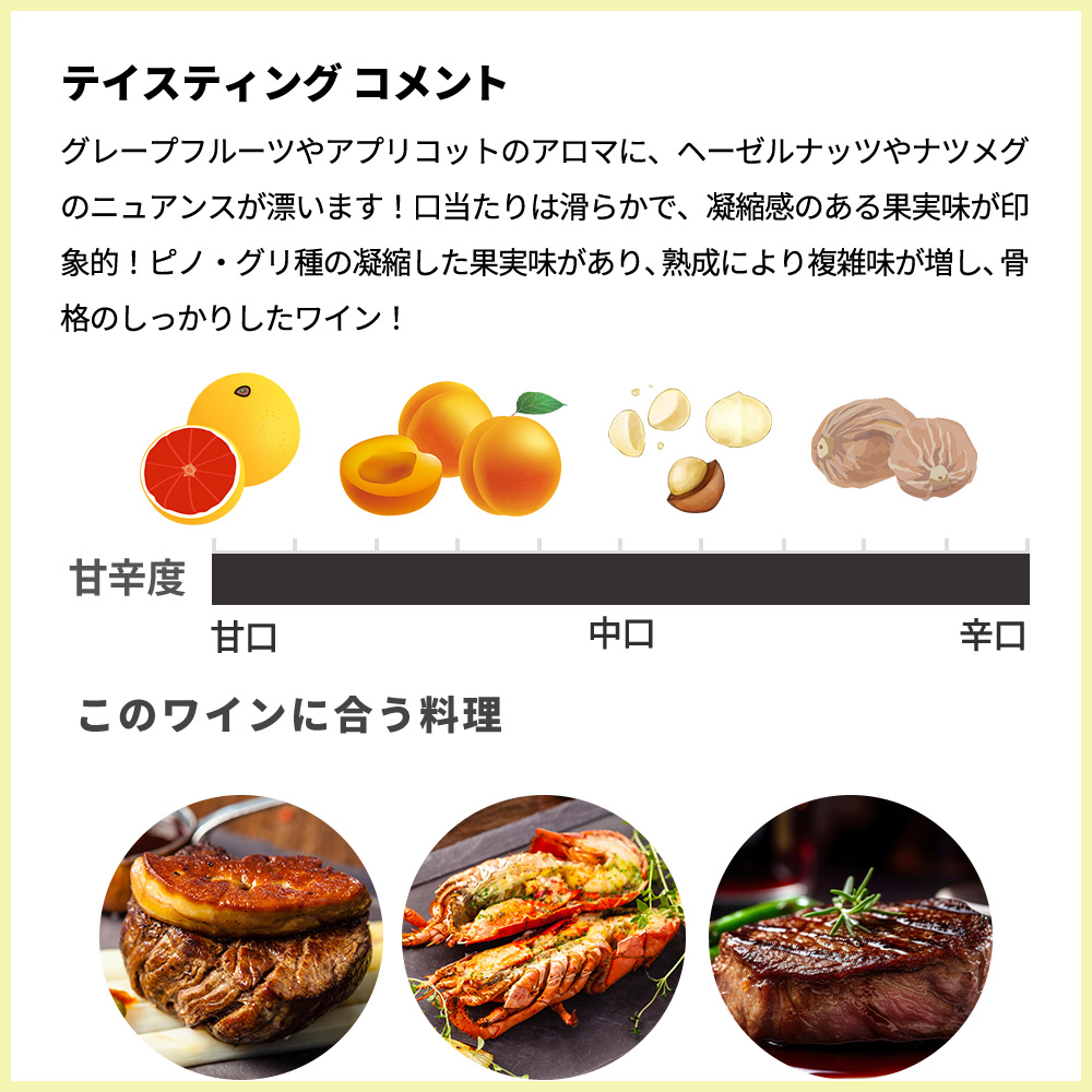 黄金色の色調!グレープフルーツやアプリコットのアロマに、ヘーゼルナッツやナツメグのニュアンスが漂います!口当たりは滑らかで、凝縮感のある果実味が印象的!ピノ・グリ種の凝縮した果実味があり、熟成により複雑味が増し、骨格のしっかりしたワイン!10年~15年の熟成ポテンシャルをもつ最高級アルザス・ピノ・グリが正規品で限定で少量入荷!トリンバック家オーナーのおすすめマリアージュは、フォアグラ、ロブスターのクリームソース、赤ワインミート、もしくはトリュフを使った高級料理とのことです!