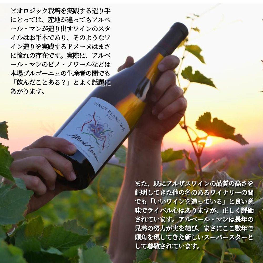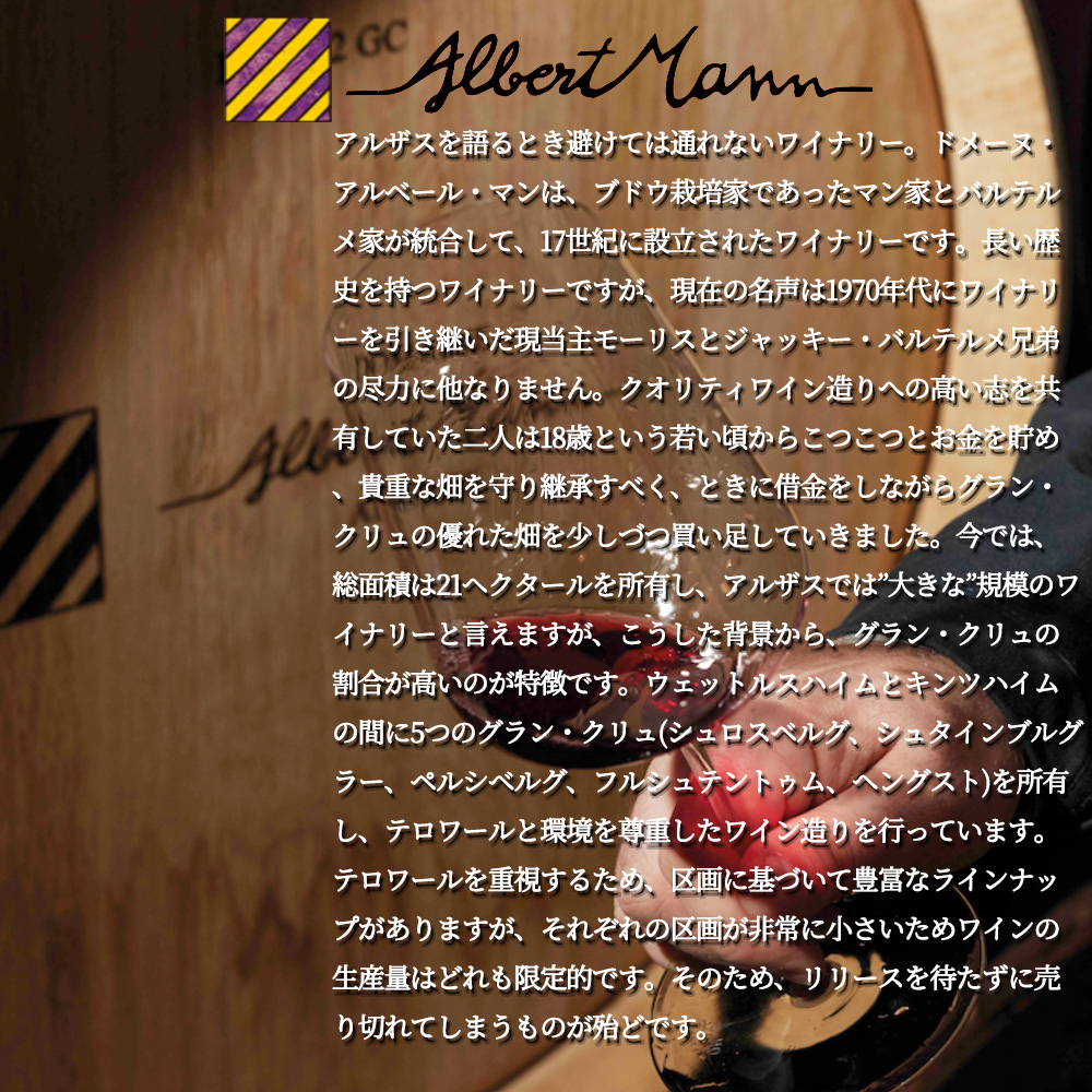 インポーターさんのコメントは「アルザスを語るとき避けては通れないワイナリー。ドメーヌ・アルベール・マンは、ブドウ栽培家であったマン家とバルテルメ家が統合して、17世紀に設立されたワイナリーです。長い歴史を持つワイナリーですが、現在の名声は1970年代にワイナリーを引き継いだ現当主モーリスとジャッキー・バルテルメ兄弟の尽力に他なりません。クオリティワイン造りへの高い志を共有していた二人は18歳という若い頃からこつこつとお金を貯め、貴重な畑を守り継承すべく、ときに借金をしながらグラン・クリュの優れた畑を少しづつ買い足していきました。今では、総面積は21ヘクタールを所有し、アルザスでは”大きな”規模のワイナリーと言えますが、こうした背景から、グラン・クリュの割合が高いのが特徴です。ウェットルスハイムとキンツハイムの間に5つのグラン・クリュ(シュロスベルグ、シュタインブルグラー、ペルシベルグ、フルシュテントゥム、ヘングスト)を所有し、テロワールと環境を尊重したワイン造りを行っています。テロワールを重視するため、区画に基づいて豊富なラインナップがありますが、それぞれの区画が非常に小さいためワインの生産量はどれも限定的です。そのため、リリースを待たずに売り切れてしまうものが殆どです。専門家の間でも評価が非常に高く、フランスで最も信頼されるワイン専門誌「レヴュ・デュ・ヴァン・ド・フランス誌(RVF)」が年に一度、フランス全土のワインを対象に年間の活動に対して表彰する「最優秀生産者賞」。各部門でたった一社しか選ばれない中、生産者部門では「アルベール・マン」が選ばれました。ロバート・パーカー氏のワインガイドでは、アルザスの伝説的スター、マルセル・ダイス、ウンブレヒト、トリンバックと並び5ッ星の評価を獲得。旧クラスマン、現「Les Meilleurs vins de France 2011版」にて、アルザスのスターワイナリー、アルベール・ボクスレ、マルセル・ダイス、ヴァインバック、ウンブレヒト、オステルタッグとともに最高評価の三ッ星を獲得。アルザスだけでなくフランスでは多くの生産者やジャーナリストがアルベール・マンのワインを高く評価しているのは周知の事実です。ビオロジック栽培を実践する造り手にとっては、産地が違ってもアルベール・マンが造り出すワインのスタイルはお手本であり、そのようなワイン造りを実践するドメーヌはまさに憧れの存在です。実際に、アルベール・マンのピノ・ノワールなどは本場ブルゴーニュの生産者の間でも「飲んだことある?」とよく話題にあがります。また、既にアルザスワインの品質の高さを証明してきた他の名のあるワイナリーの間でも「いいワインを造っている」と良い意味でライバル心はありますが、正しく評価されています。アルベール・マンは長年の兄弟の努力が実を結び、まさにここ数年で頭角を現してきた新しいスーパースターとして尊敬されています。」