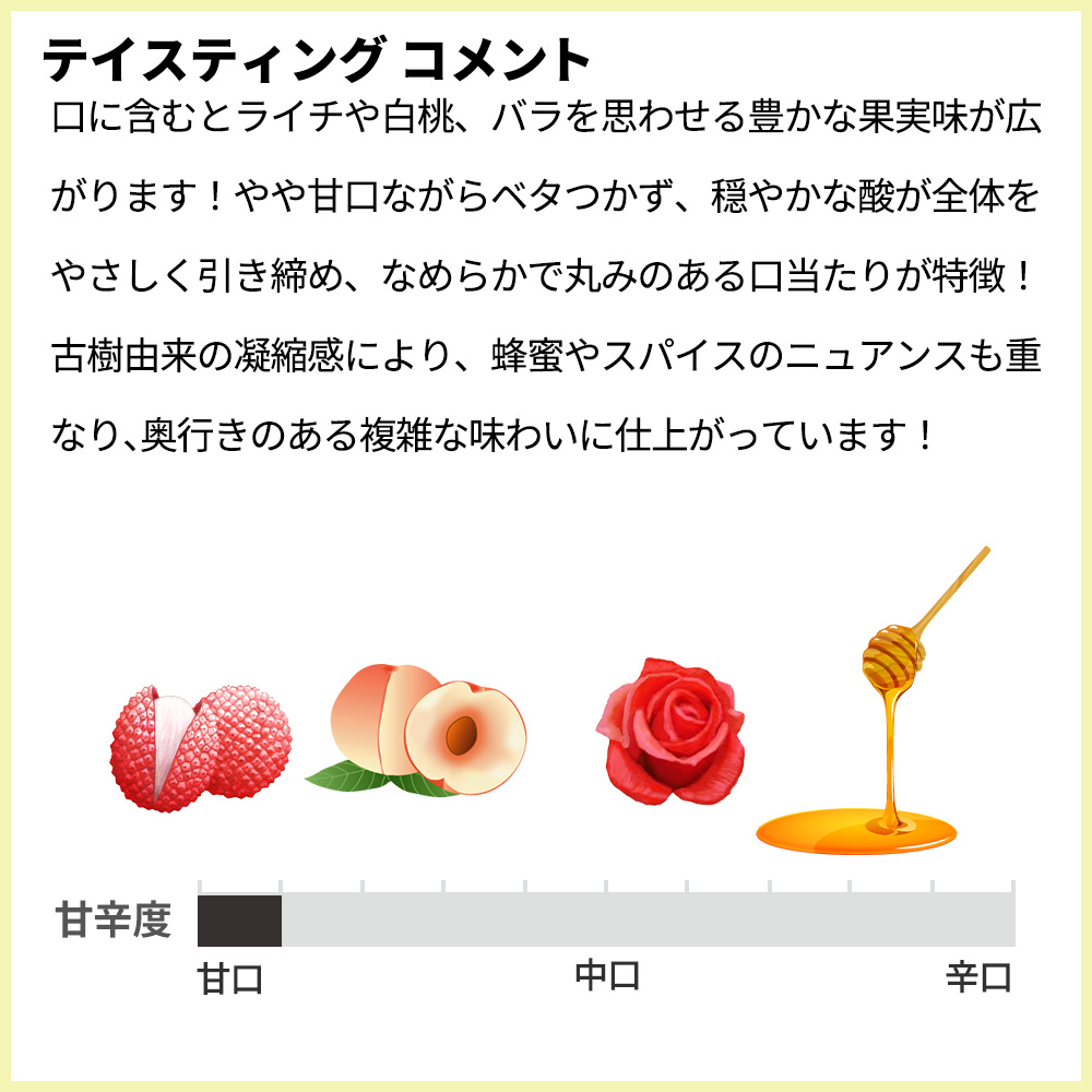 華やかな香りに導かれ、口に含むとライチや白桃、バラを思わせる豊かな果実味が広がります!やや甘口ながらベタつかず、穏やかな酸が全体をやさしく引き締め、なめらかで丸みのある口当たりが特徴!古樹由来の凝縮感により、蜂蜜やスパイスのニュアンスも重なり、奥行きのある複雑な味わいに仕上がっています!余韻は長く、上品な甘みと芳香がゆっくりと続きます!