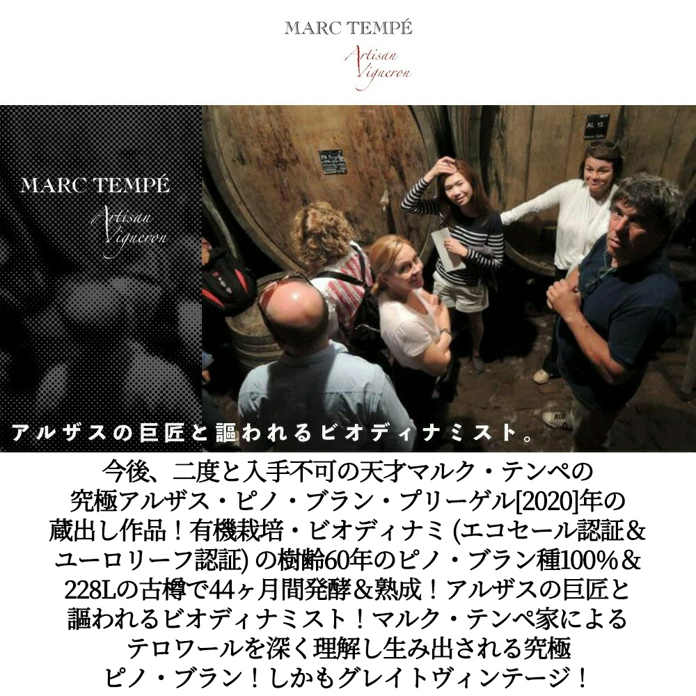 希少!入手困難!アルザス・ピノ・ブラン辛口白ワイン愛好家大注目!自然派・有機栽培・ビオディナミ (エコセール認証&ユーロリーフ認証) の樹齢60年のピノ・ブラン種100%&228Lの古樽で44ヶ月間発酵&熟成ピノ・ブラン愛好家大注目!アルザスの巨匠と謳われるビオディナミスト!マルク・テンペ家によるテロワールを深く理解し生み出される究極ピノ・ブラン!しかもグレイトヴィンテージの2020年もの! (アシェット・ガイド誌2026年版ではアルザスに17点&RVF誌96点の高評価!)