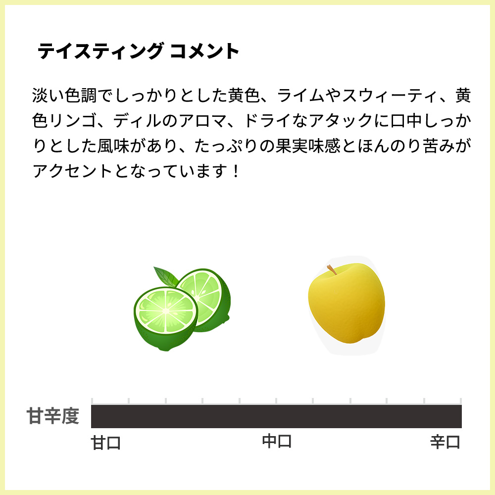 インポーターさんのテイスティングコメントは外観は透明感のある山吹色。粘性高め。口当たりの柔らかさ、コンポートした洋ナシ、白桃のようなフローラルな果実香、軟水のようなミネラル感、白い粒胡椒の香りのようなスパイスも。余韻にほのかな樽香とリンゴの蜜のような優しい甘味も。抜栓後は安定感抜群なので数日間から一週間かけてゆっくりと楽しめそうです。(2025/10)