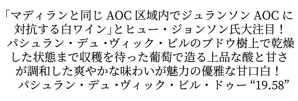 フランス南西地方(シェッド・ウェスト地方)甘口白ワイン愛好家大注目!ワイン評論家のヒュー・ジョンソン氏に「マディランと同じAOC区域内でジュランソンAOCに対抗する白ワイン」と大注目させたAOCパシュラン・デュ・ヴィック・ビル!