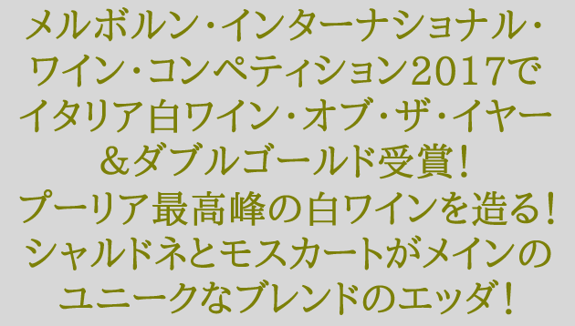 【ブドウの品種】シャルドネ60%/フィアーノ・ミニュトーロ20%/モスカート15%/他5%