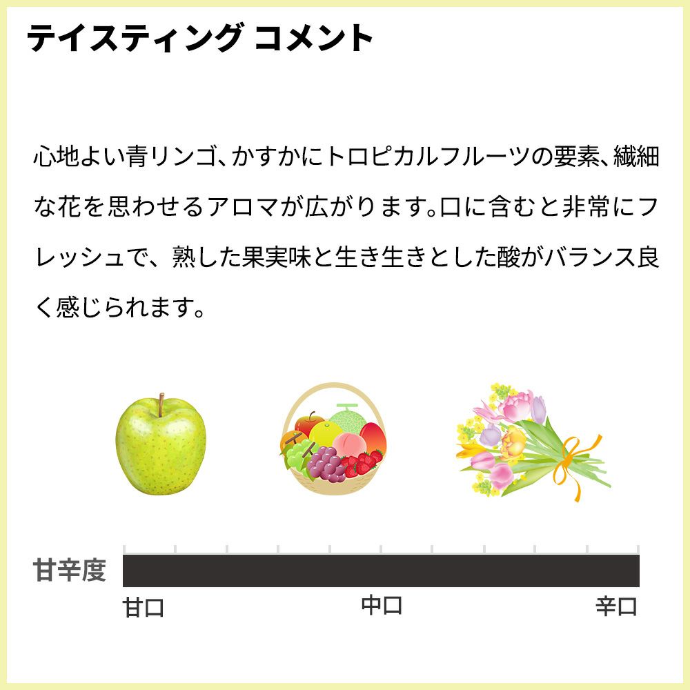 輝きのある淡い麦わら色、心地よい青リンゴ、かすかにトロピカルフルーツの要素、繊細な花を思わせるアロマが広がります。口に含むと非常にフレッシュで、熟した果実味と生き生きとした酸がバランス良く感じられます。